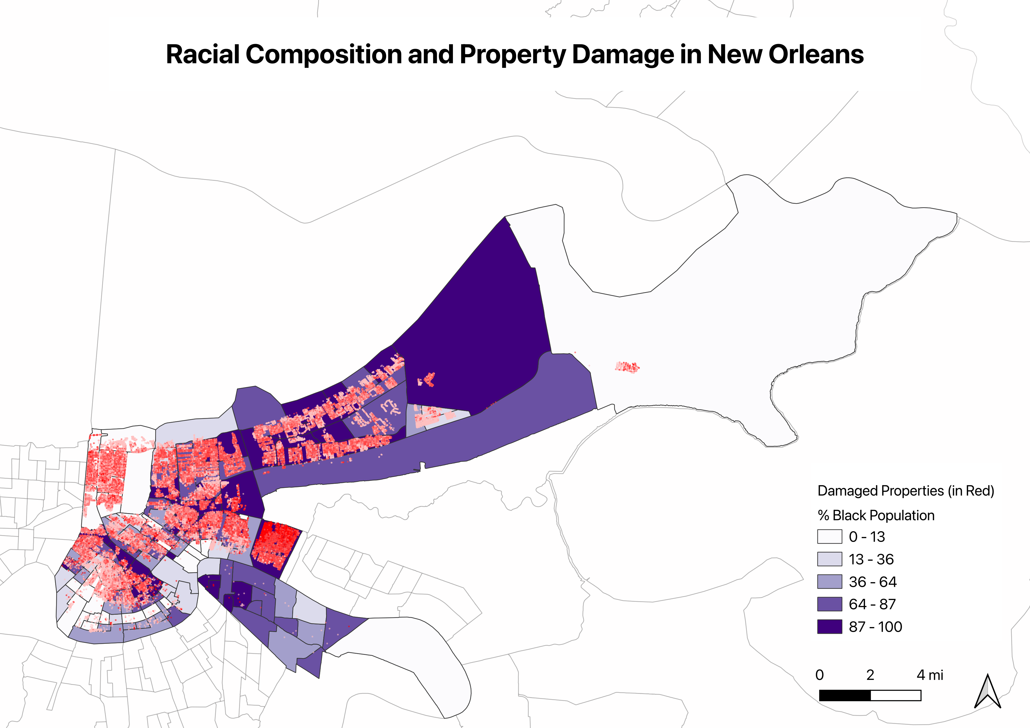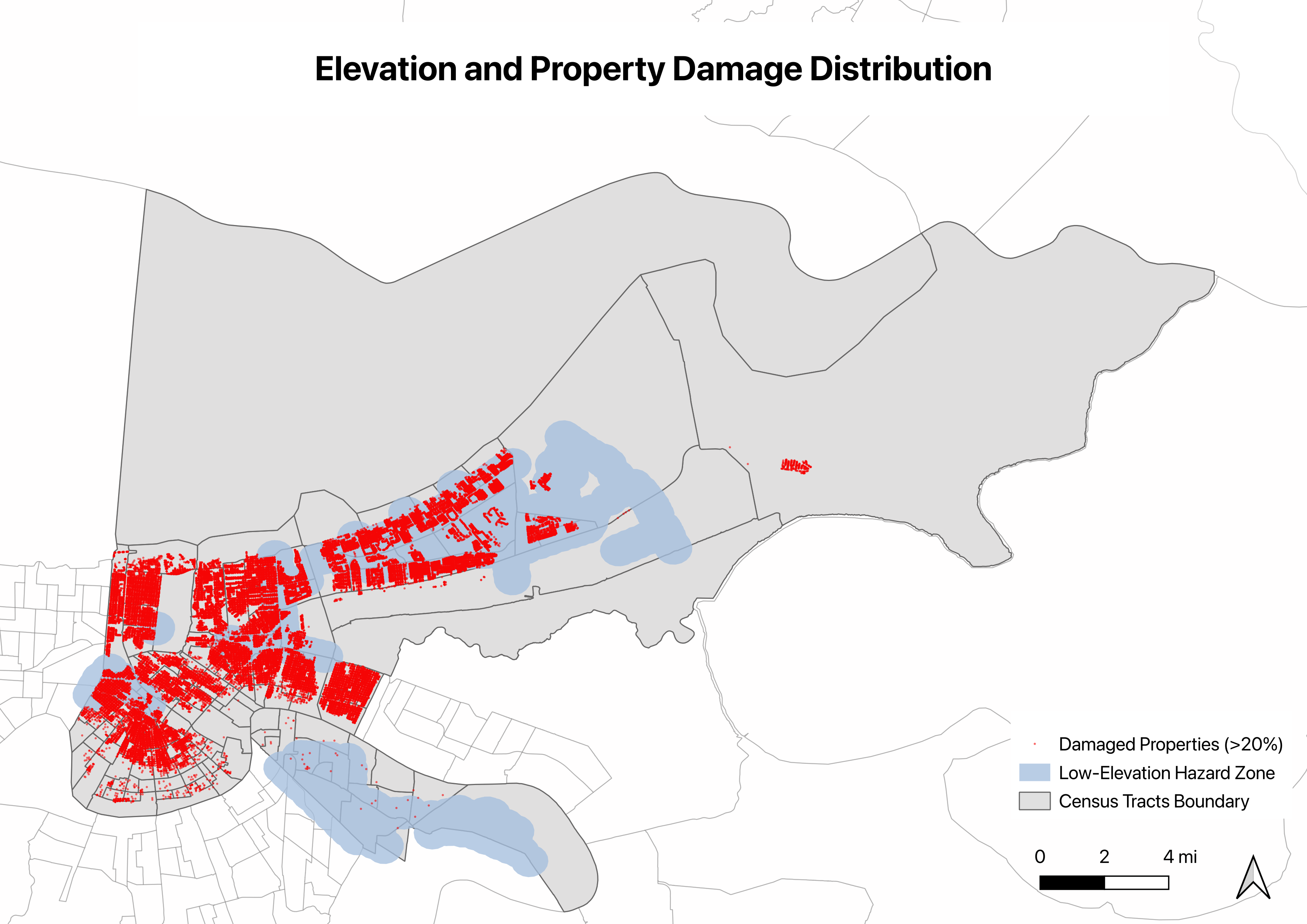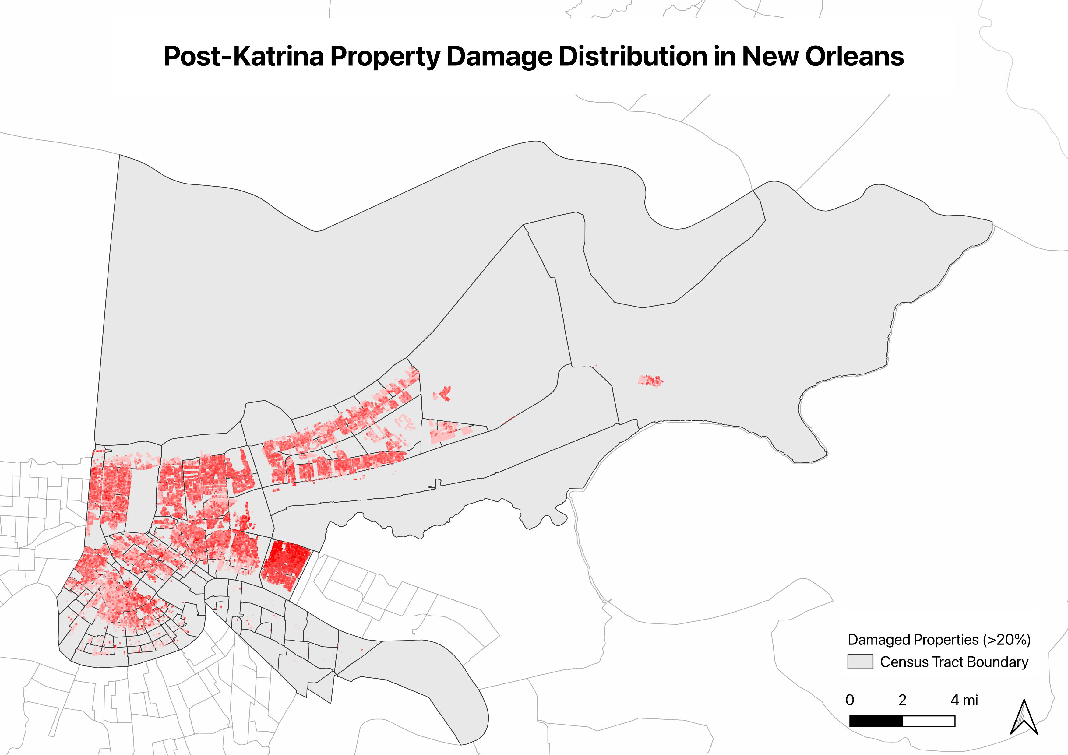 Using GIS spatial analysis and publicly available data, I mapped every significantly damaged property in New Orleans and overlaid it with census demographics. The patterns I found are consistent across every dimension I tested. Katrina’s damage was concentrated in predominantly Black, lower-income neighborhoods sitting below sea level, and twenty years later, many of those neighborhoods still haven’t fully recovered.