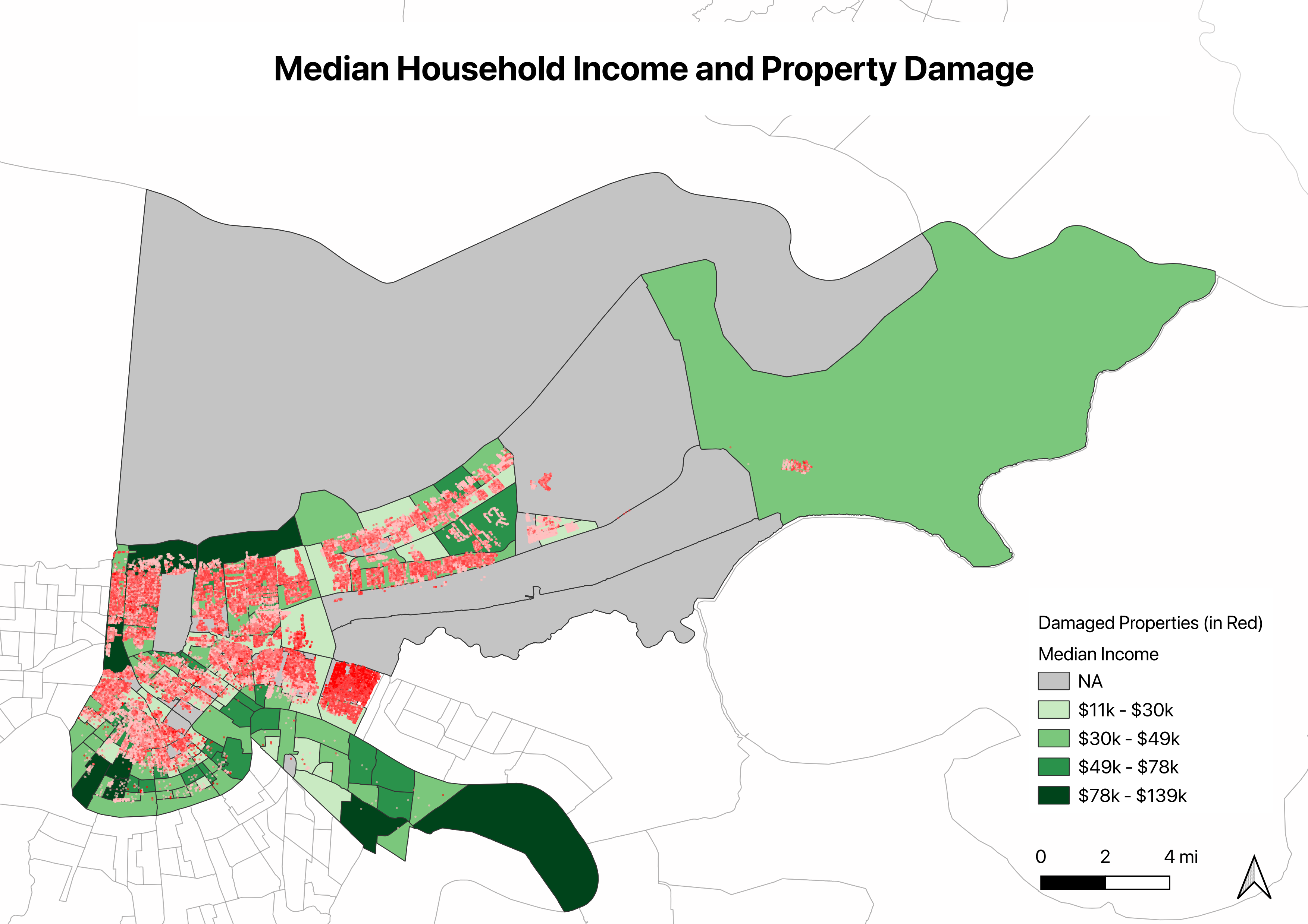 The income pattern reinforces the racial one. The five most damaged tracts had median household incomes between $16,130 and $33,427, well below the citywide average of $43,168, and four of the five fell below $35,000.