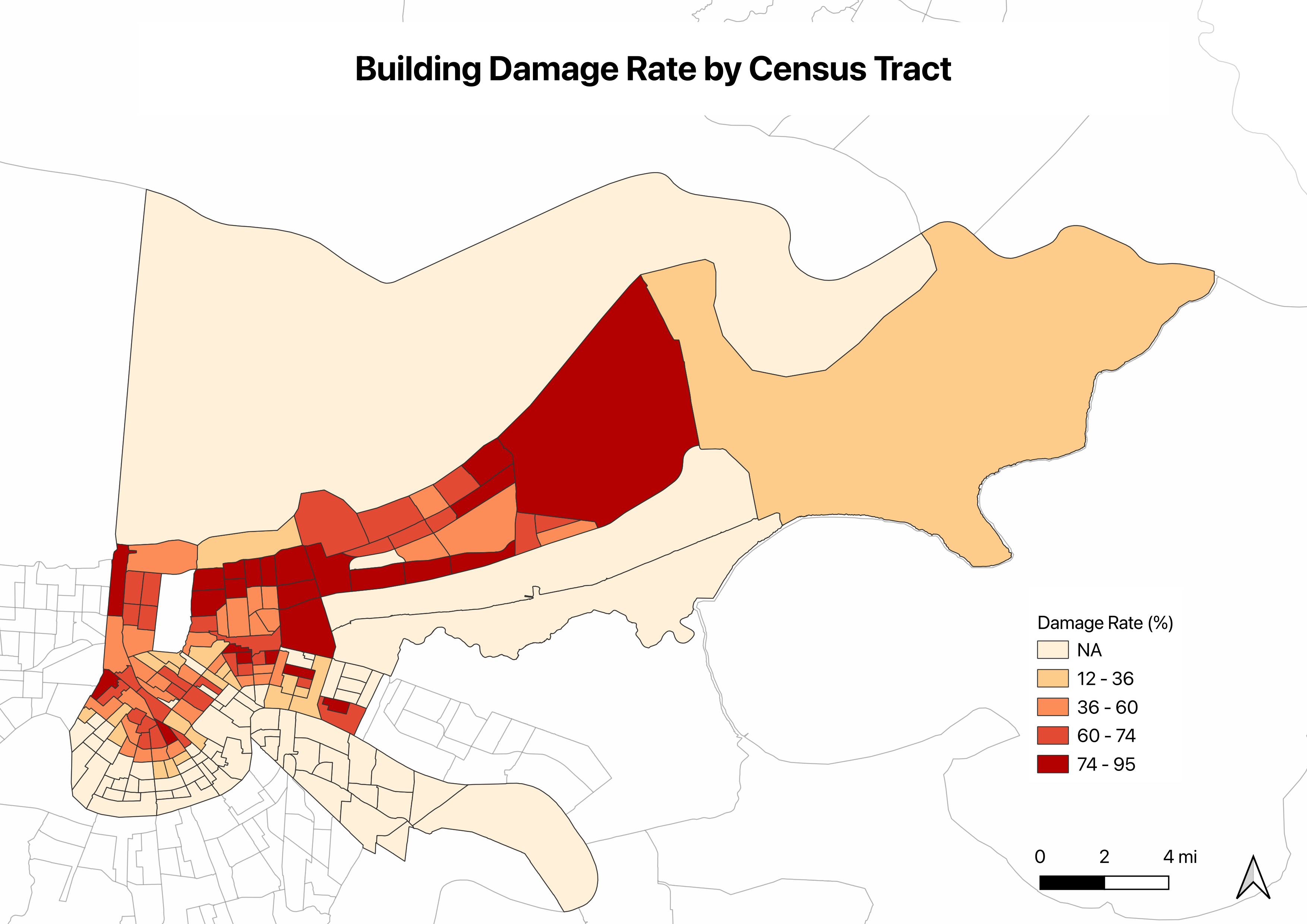 The damage was not random. It followed a clear geographic pattern, concentrated in central and eastern New Orlean.