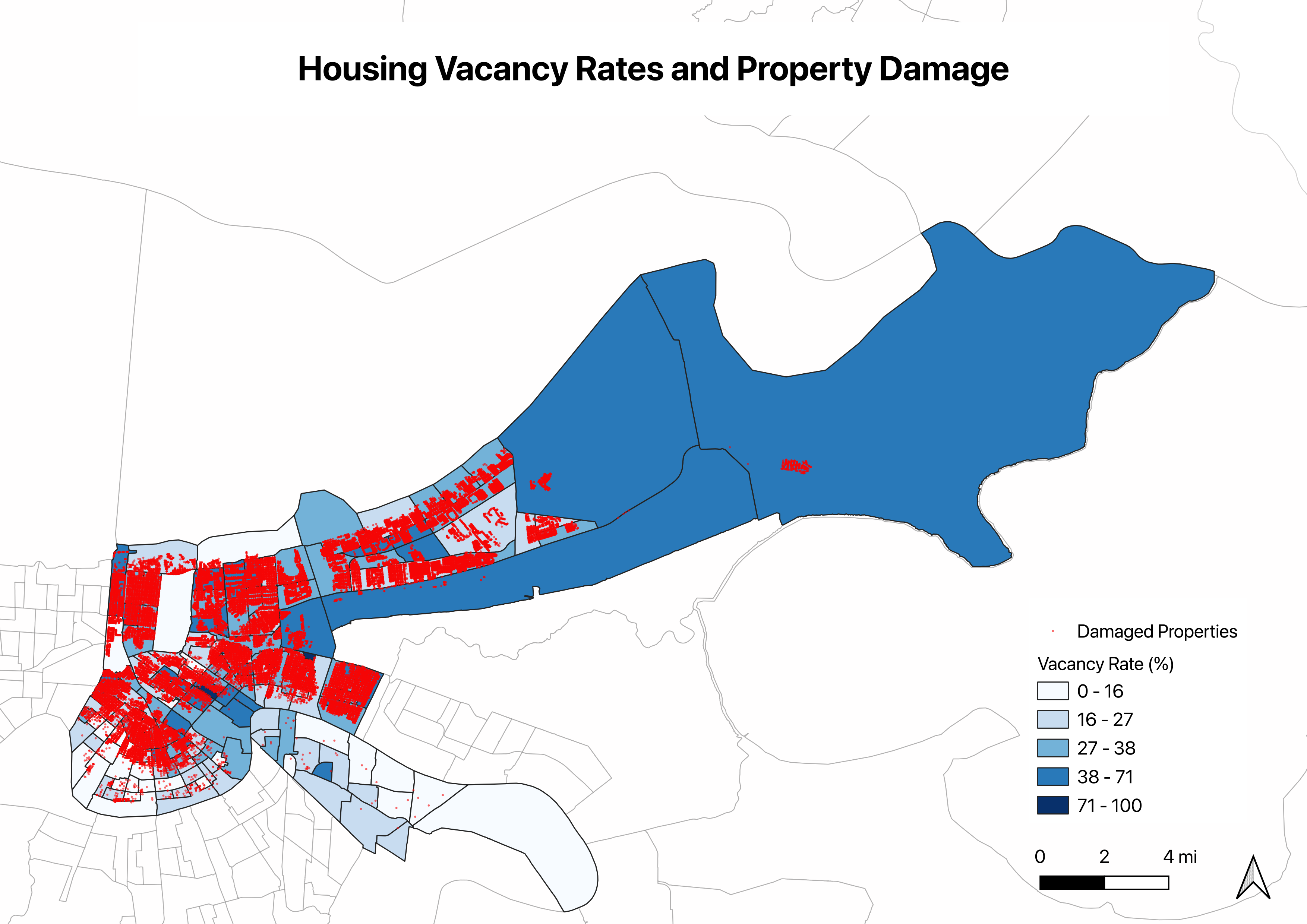 Across the five dimensions I examined, racial composition, median income, elevation, and post-storm vacancy, the spatial patterns all pointed toward the same tracts with the highest damage rates. Tracts with higher damage rates tended to have higher shares of Black residents, lower median incomes, and higher vacancy rates after the storm. These variables were not randomly distributed across the city. They systematically occurred in the same geographic areas.